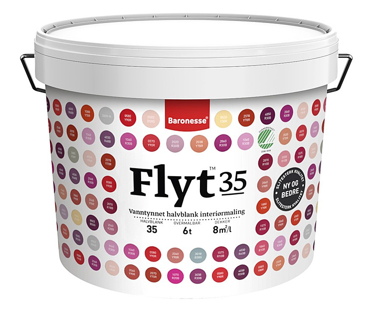 Baronesse Flyt 35 base hvit, base A, base B og base C Last updated 27 Aug 2025 Barcode (GTIN): 7071966108348,7071966108331,7071966108324,7071966108317,7071966108300,7071966108294,7071966108287,7071966108270 Type: Innendørsmaling Licensing number: 2096 0006 Environment branding: Svanemerket Brand: Baronesse Licensing company: Gjøco AS Licensing website: http://www.gjoco.no See also Svanemerkets krav til maling, beis og lakk