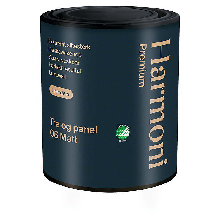 Harmoni Premium Panel og Tre 05 base hvit, base A, base B og base C Last updated 27 Aug 2025 Barcode (GTIN): 7041530044785,7041530044792,7041530044556,7041530044563,7041530044570,7041530044587,7041530044594,7041530044600,7041530044617,7041530044624,7041530044631,7041530044648 Type: Innendørsmaling Licensing number: 2096 0006 Environment branding: Svanemerket Brand: Harmoni Brand website: https://www.maxbo.no/merker/harmoni/ Licensing company: Gjøco AS Licensing website: http://www.gjoco.no See also Svanemerkets krav til maling, beis og lakk