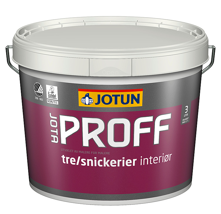 JOTAPROFF Tre-Snickerier 40 Last updated 13 Oct 2025 Barcode (GTIN): 7029350002505 Type: Innendørsmaling Licensing number: 2096 0002 Environment branding: Svanemerket Brand: Jotun JOTAPROFF Brand website: https://www.jotun.com/no-no/decorative/professional/produkter/hva-er-jotaproff Licensing company: Jotun A/S Licensing website: http://www.jotun.no/ See also Svanemerkets krav til maling, beis og lakk