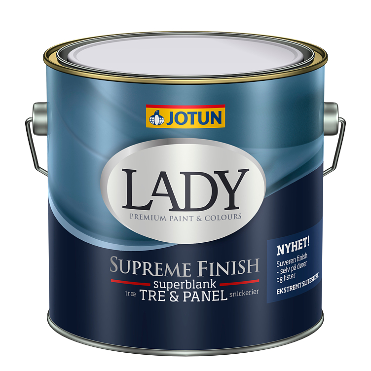 LADY Supreme Finish Superblank base A, B, C og hvit Last updated 08 Aug 2025 Barcode (GTIN): 7029350207733,7029350207740,7029350207764,7029350207757,7029350207771,7029350207788,7029350207795,7029350207801,7029350002925,7029350002789,7029350002734,7029350002758,7029350002765,7029350002741,7029350002772 Type: Innendørsmaling Licensing number: 2096 0002 Environment branding: Svanemerket Brand: Jotun Lady Brand website: https://www.jotun.com/no/no/decorative/interior/products?brands=lady&brands=LADY Licensing company: Jotun A/S Licensing website: http://www.jotun.no/ See also Svanemerkets krav til maling, beis og lakk