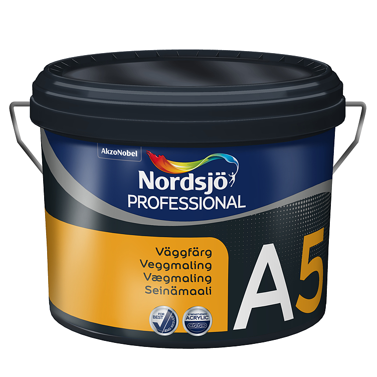Nordsjö PROFESSIONAL A5 S 0500-N Last updated 01 Jul 2025 Barcode (GTIN): 7391306190469,7391306192616,7391306189036 Type: Innendørsmaling Licensing number: 3096 0003 Environment branding: Svanemerket Brand: Nordsjö Professional Licensing company: Akzo Nobel Decorative Coatings AB Licensing website: https://www.akzonobel.com/ See also Svanemerkets krav til maling, beis og lakk